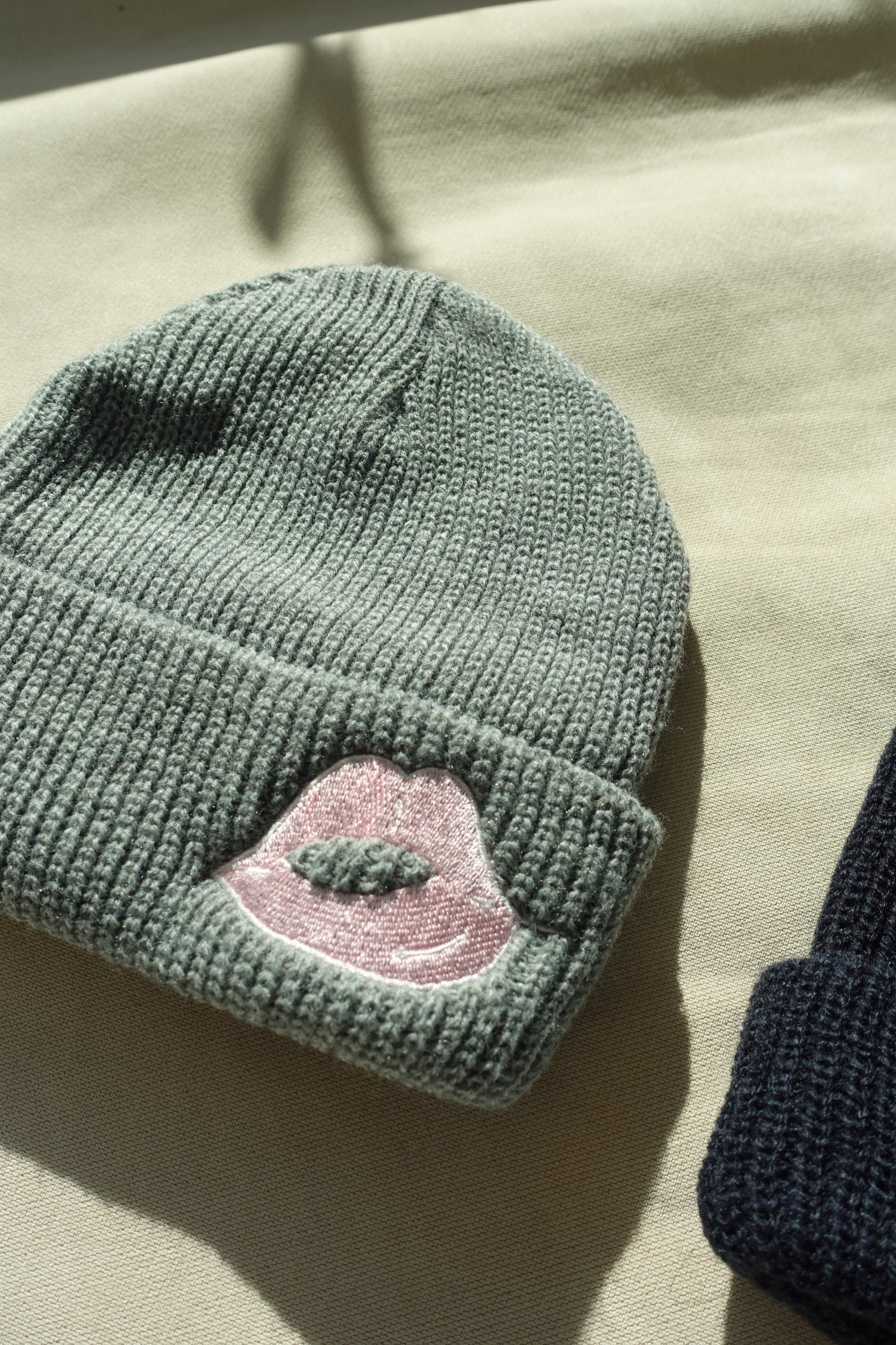 赤ちゃんの唇をモチーフにしたピンクの刺繍が特徴の1枚。